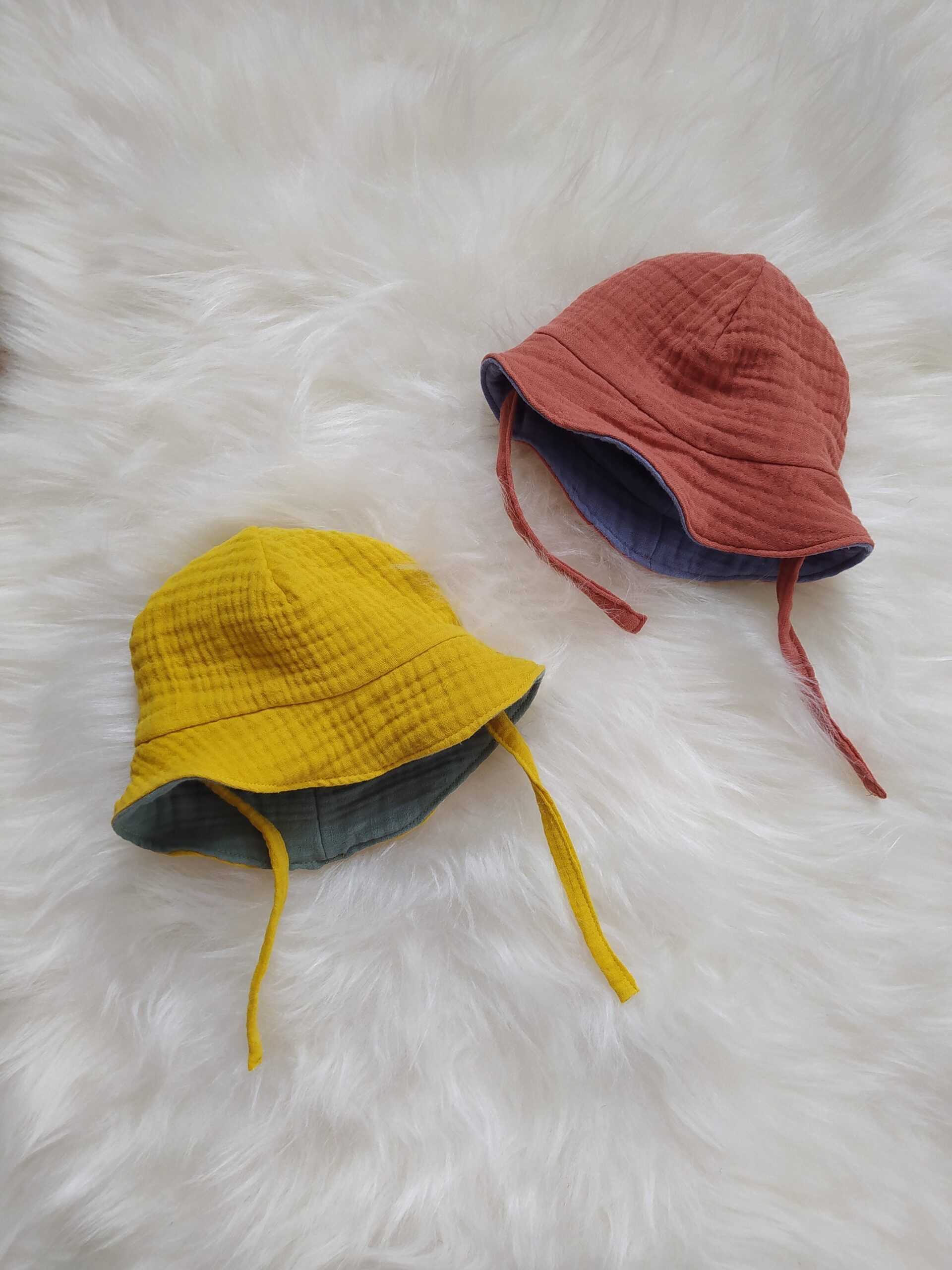Our colorful muslin hats can be used on both sides.